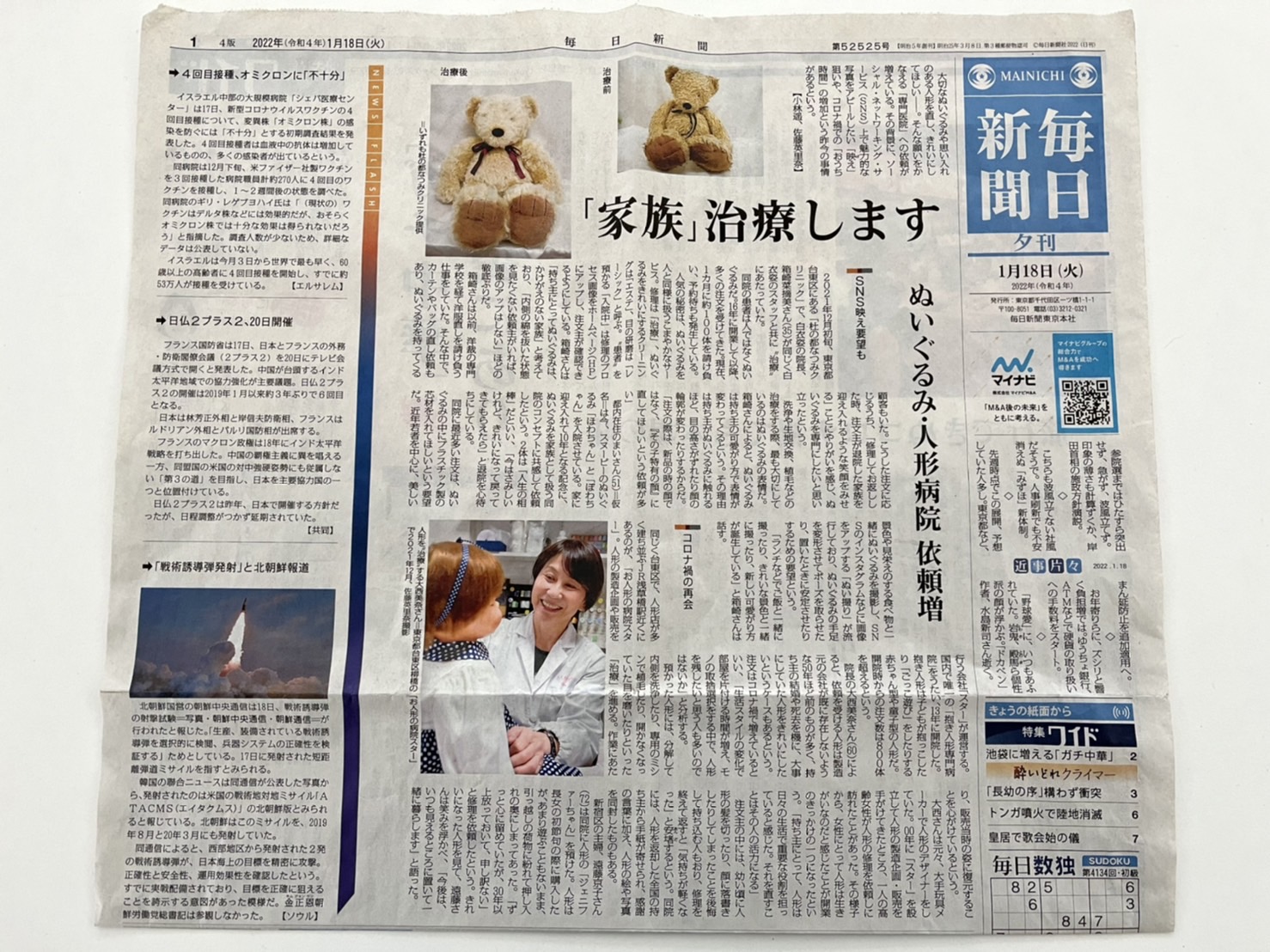 人形修理/修繕/再生事業「お人形の病院スター」が日新聞夕刊に掲載されました。 お人形の病院スターは、お人形の修理、修繕、再生を目的とした日本で唯一の抱き人形専門病院です。 愛着のある大切なお人形。 これから先の未来も変わらず一緒に過ごして頂ける様、あえて修理や修繕と呼ばずに治療と呼んでいます。