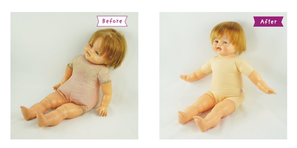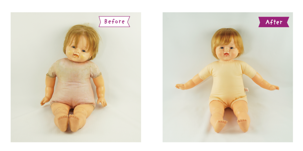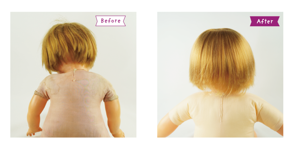 *顔・腕・脚 ビニール部分のクリーニング *髪の毛のシャンプー・セット *増毛 *顔の彩色直し *布ボディの新調 *セミオーダードレスセット(ラウンドカラー白えり)