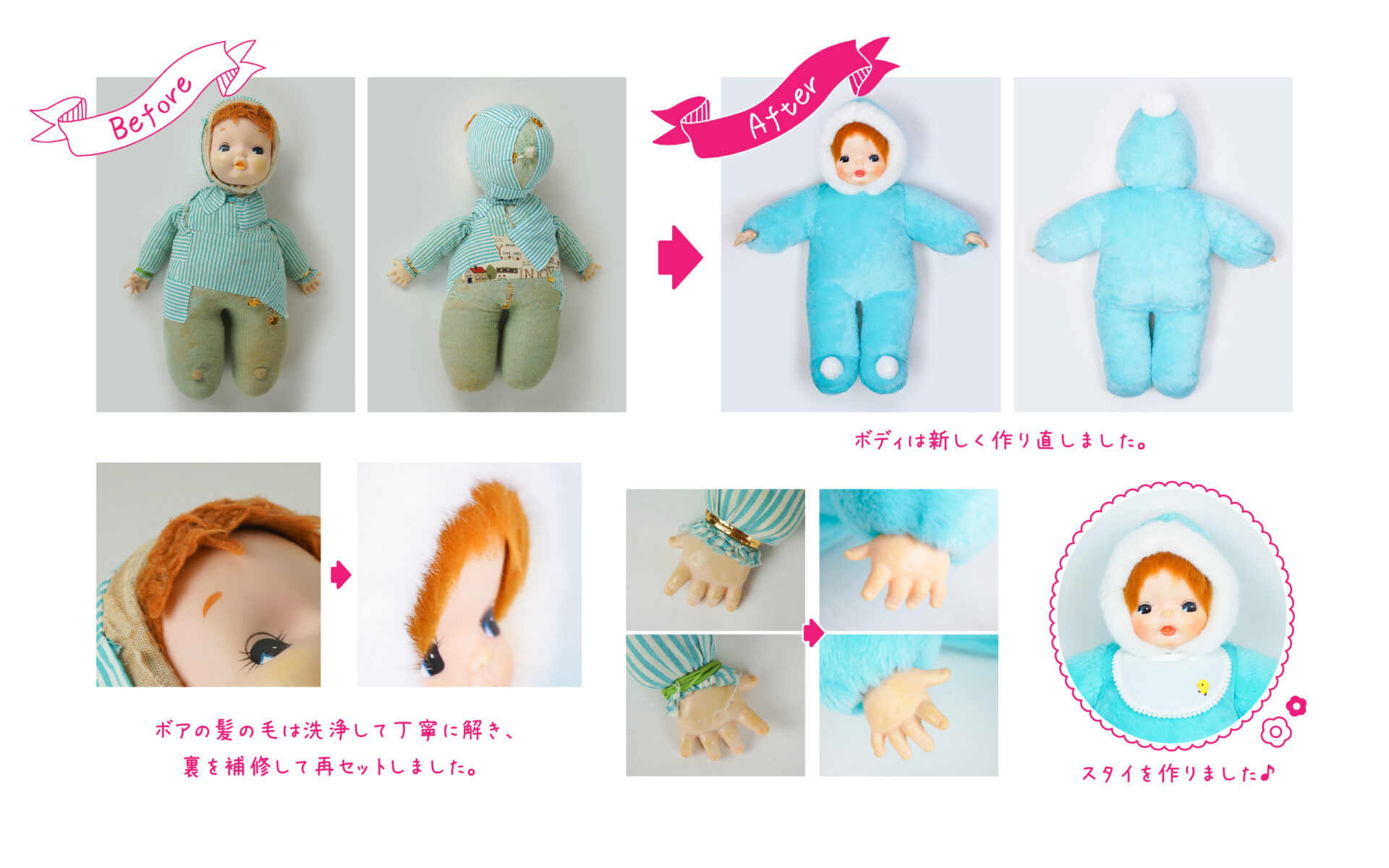 ボアの髪の毛は洗浄及び補修をして再セットし直しました。