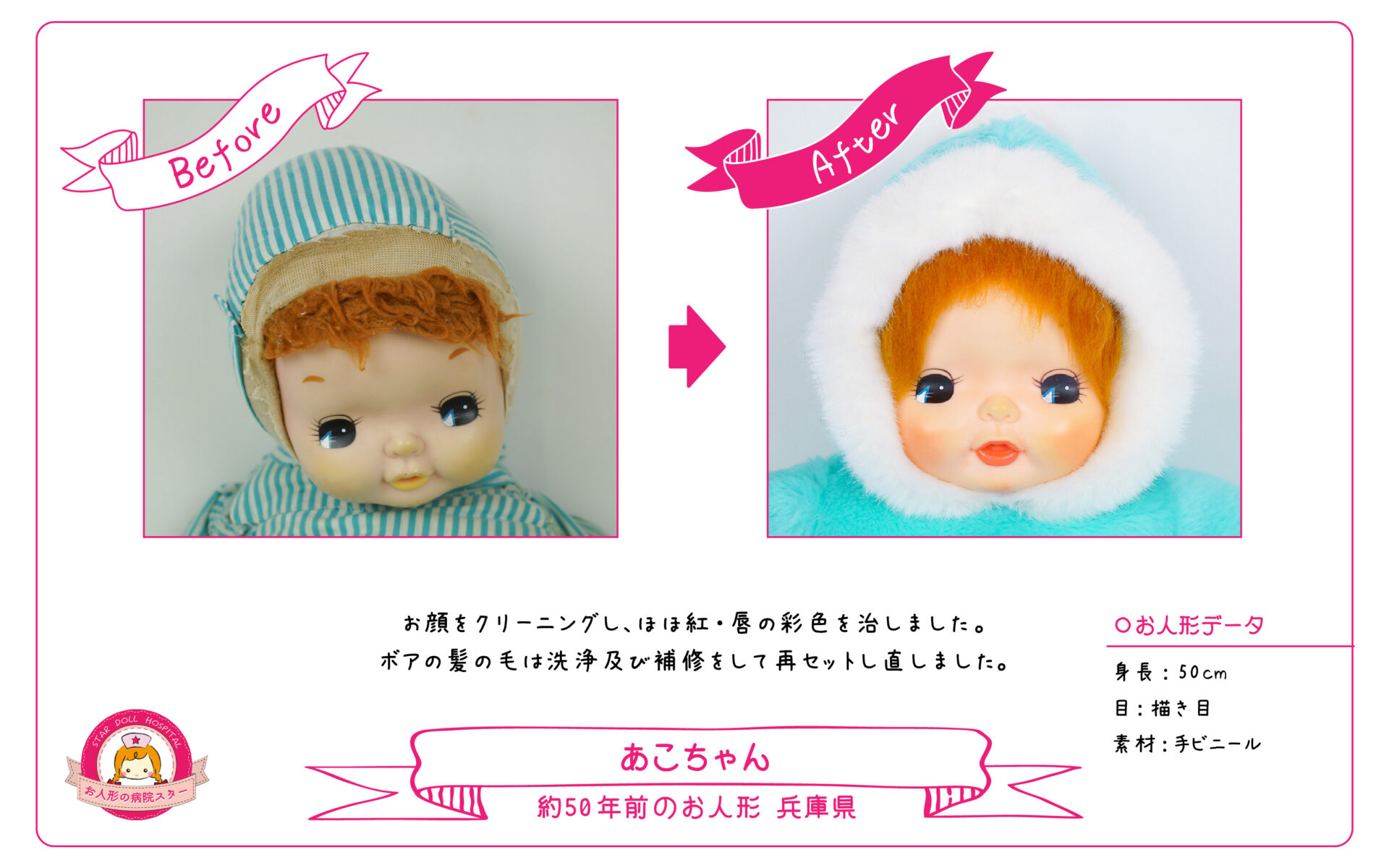 お顔をクリーニングをし、ほほ紅・唇の彩色を治しました。