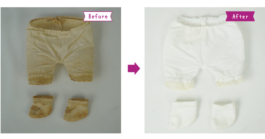 元のドロワーズとソックスをクリーニング&補修しました。