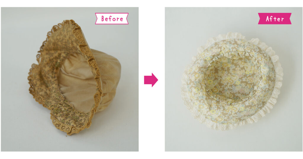 お帽子はリバーシブル仕立てにし、花柄、無地、どちらでも被れるようにしました。