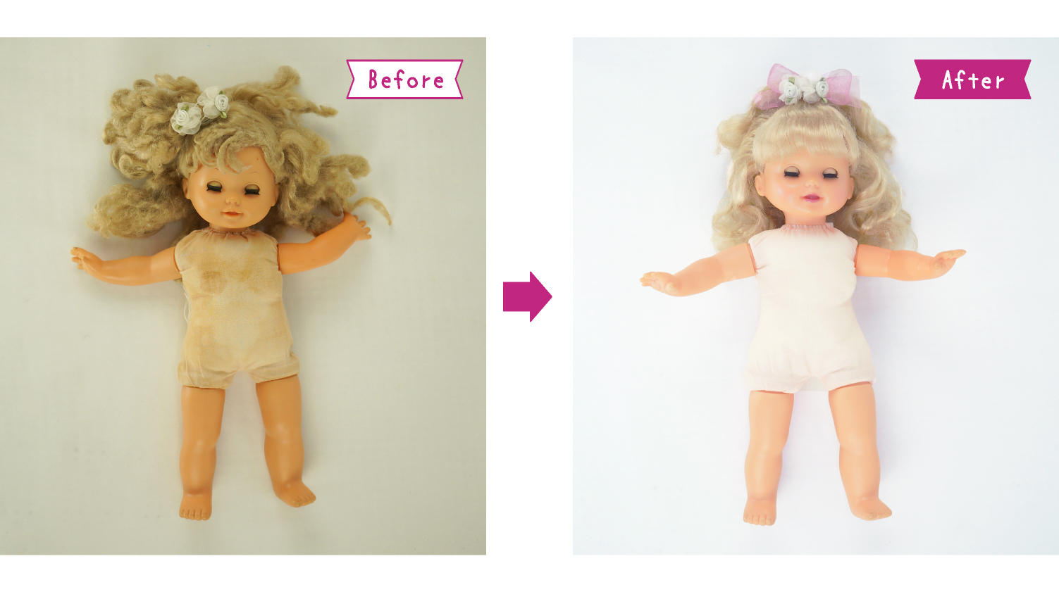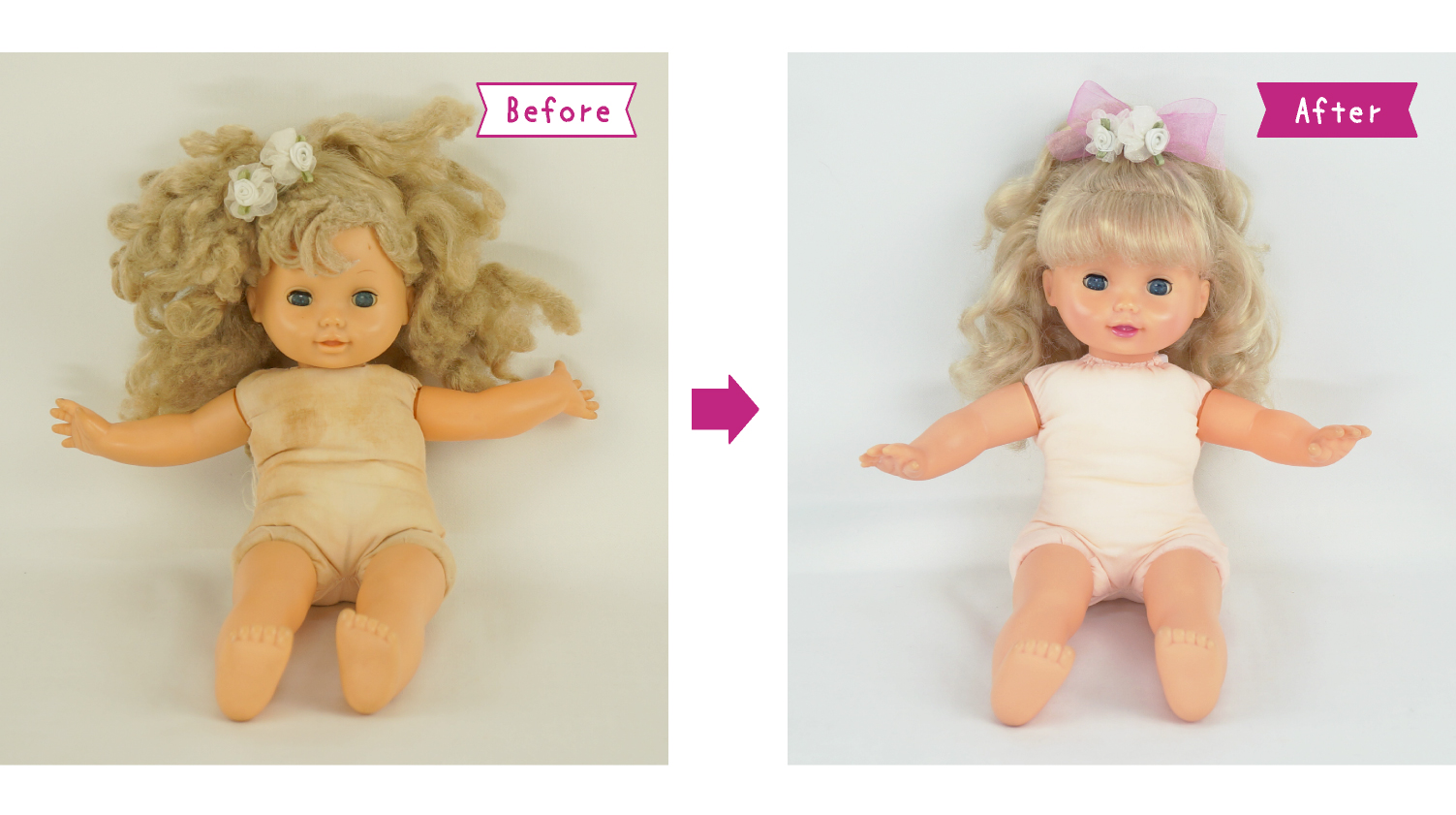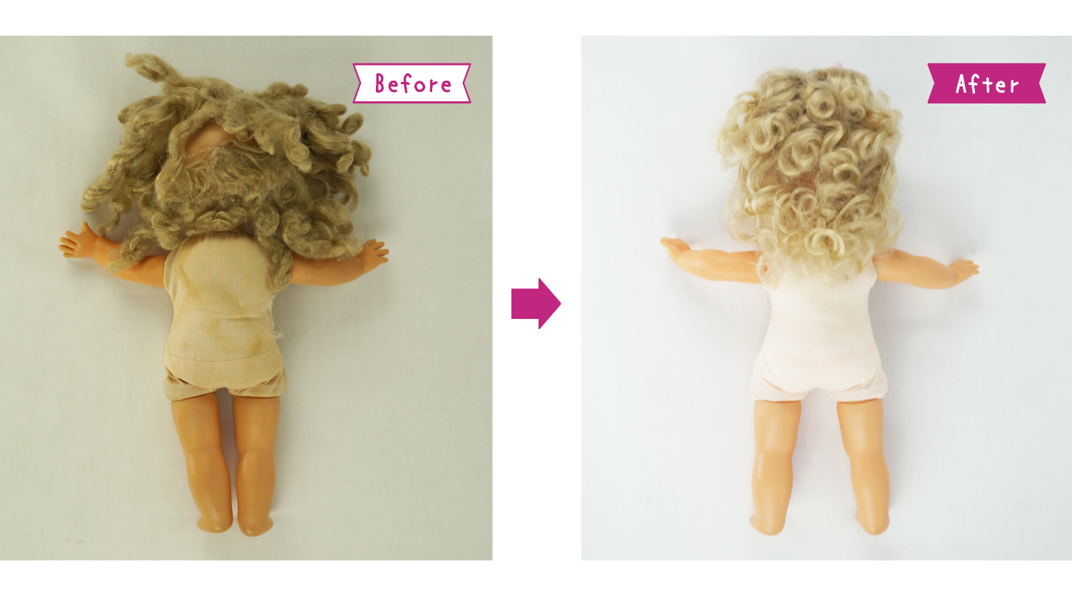 *顔・腕・脚,ソフトビニール部分のクリーニング *髪の毛のシャンプー・カールセット *お顔の彩色直し(唇・口の中・歯・ほほ) *眠り目の治療 *布ボディのクリーニング