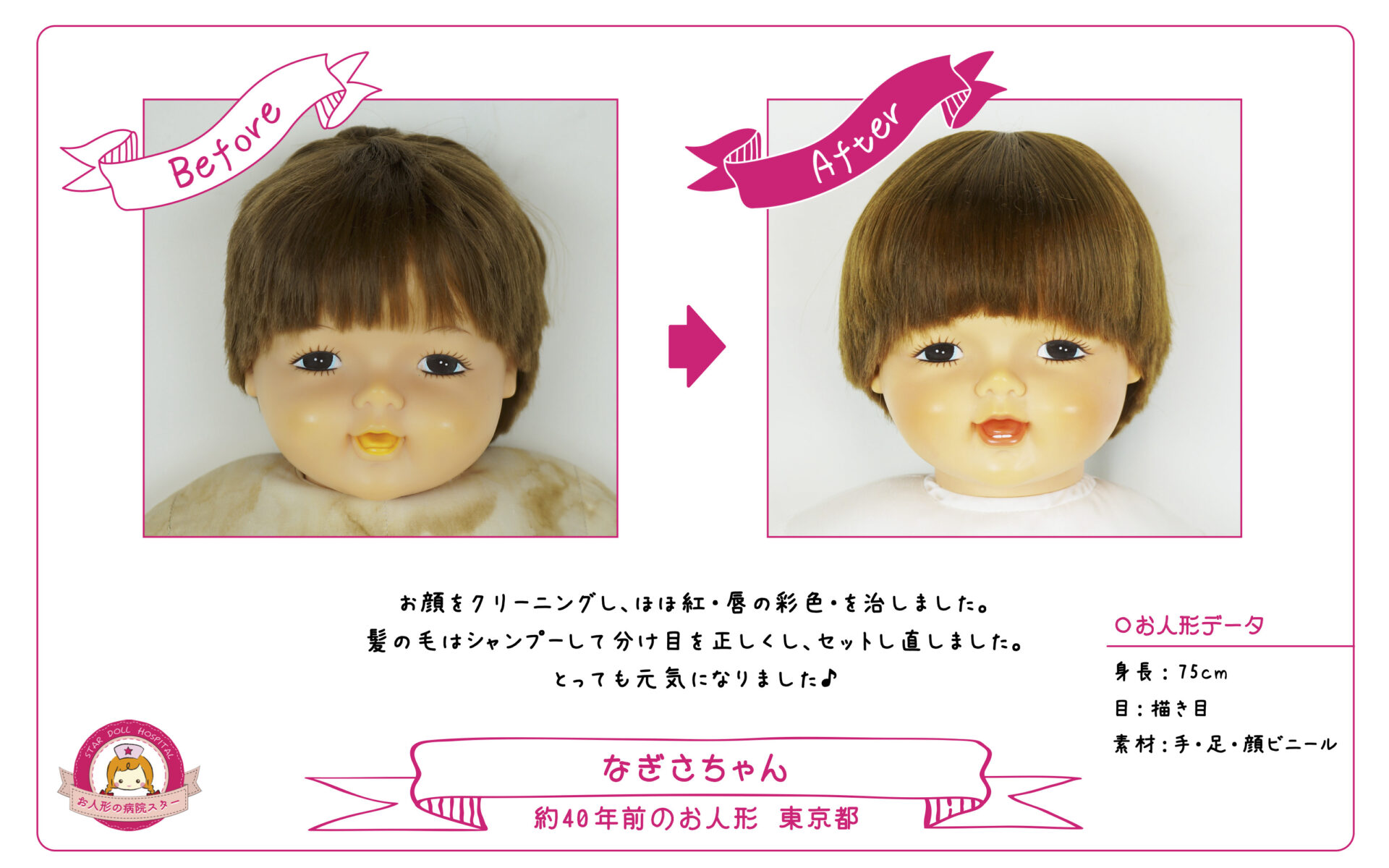お顔のクリーニングをし、ほほ紅・唇の彩色を治しました。