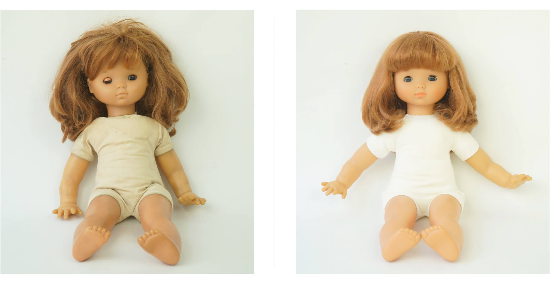*お顔・手足ソフトビニール部分のクリーニング *髪の毛のシャンプー *左目の治療(目袋の再生・手術) *ボディのクリーニング