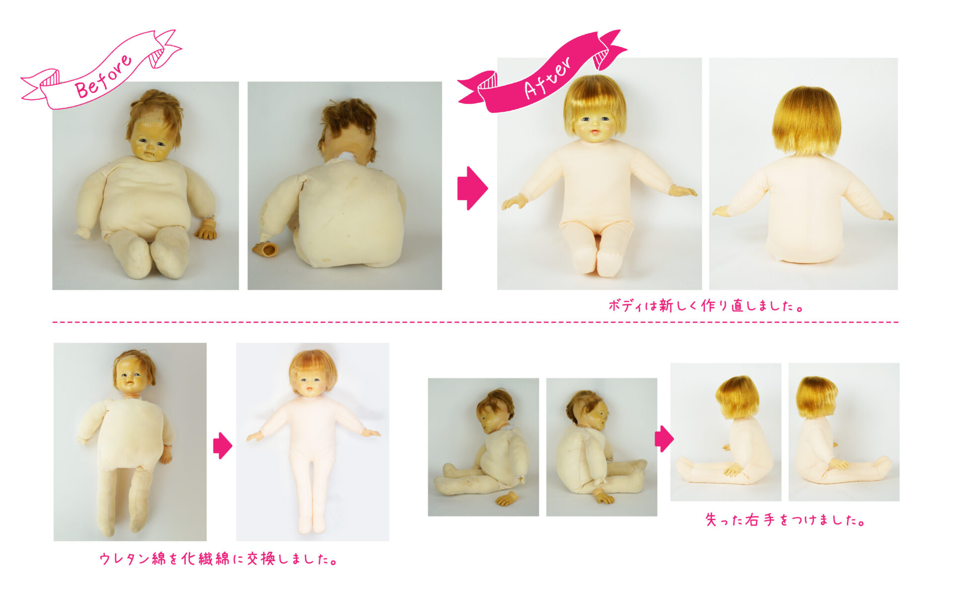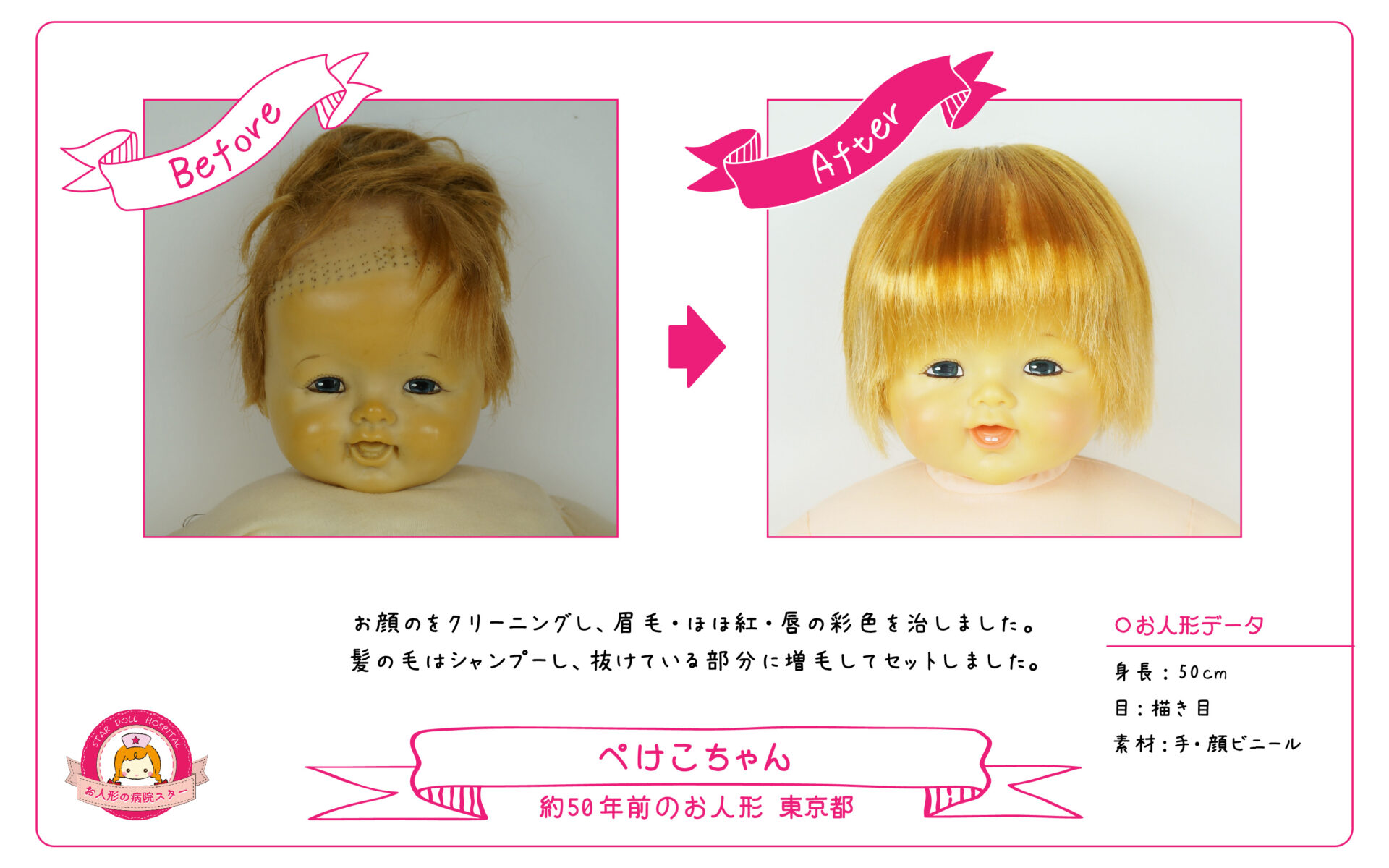 お顔のクリーニングをし、眉毛・ほほ紅・唇の彩色を治しました。