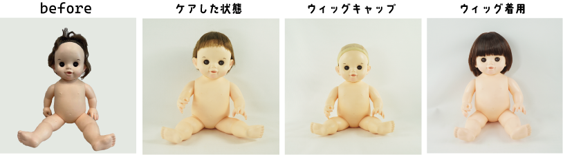 *髪の毛のシャンプー *お顔・手・足の汚れ落とし *髪の毛のメンテナンス・毛流れを戻す *ウイッグキャップのセット *ウイッグの選定・髪の毛のカット&セット