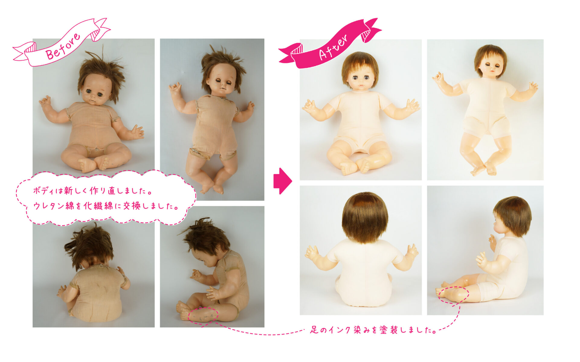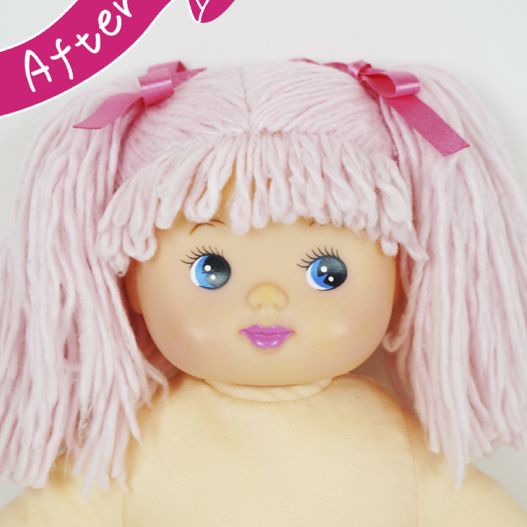 お顔のクリーニングをし、ほほ紅・唇の彩色を治しました。