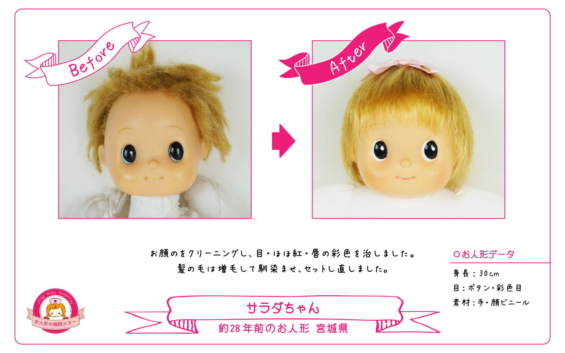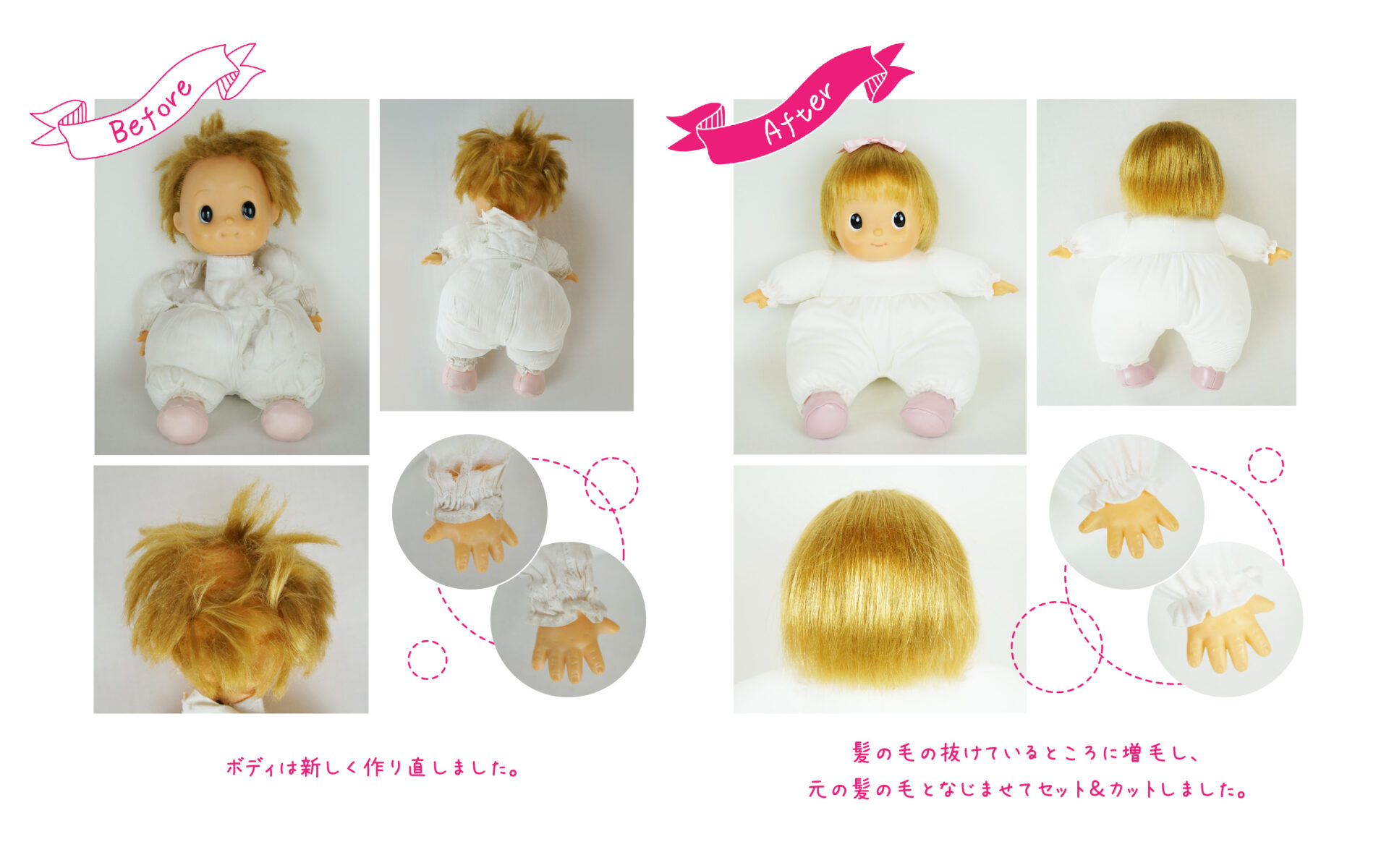 お顔をクリーニングし、目・ほほ紅・唇の彩色を治しました。
